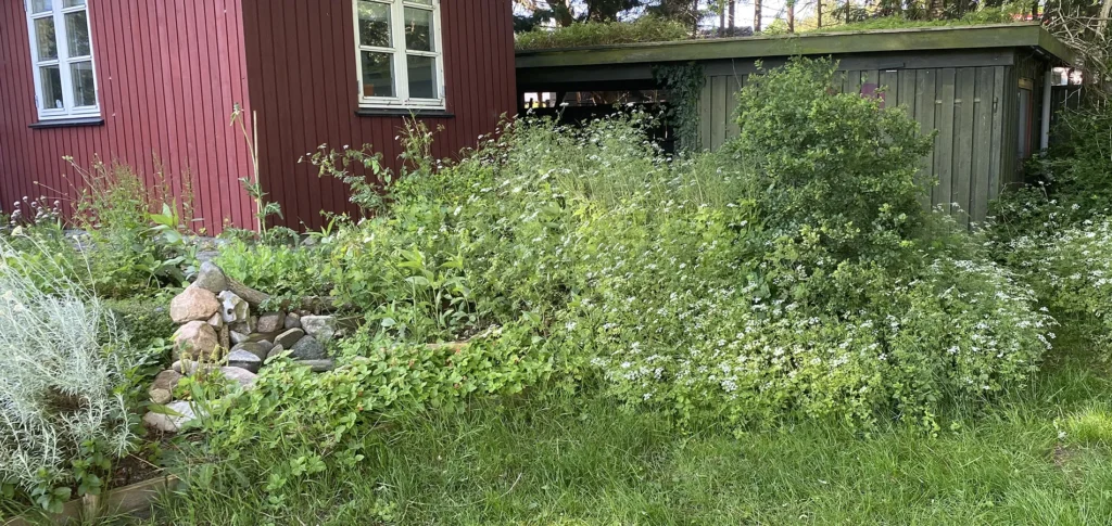 2024: Små skud i skovbeddet, virkelig mange skud i staudebeddet.