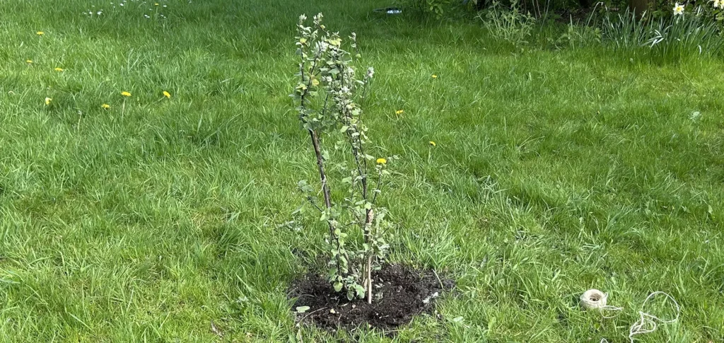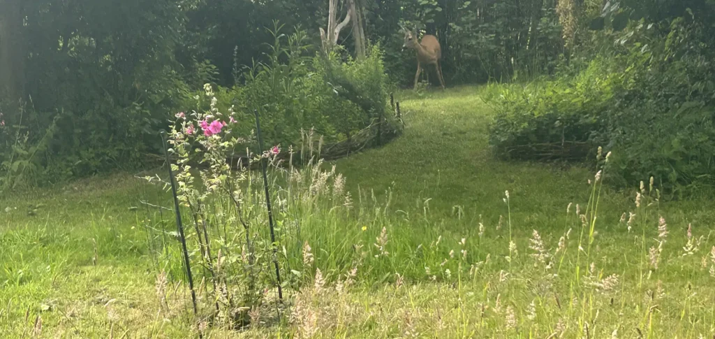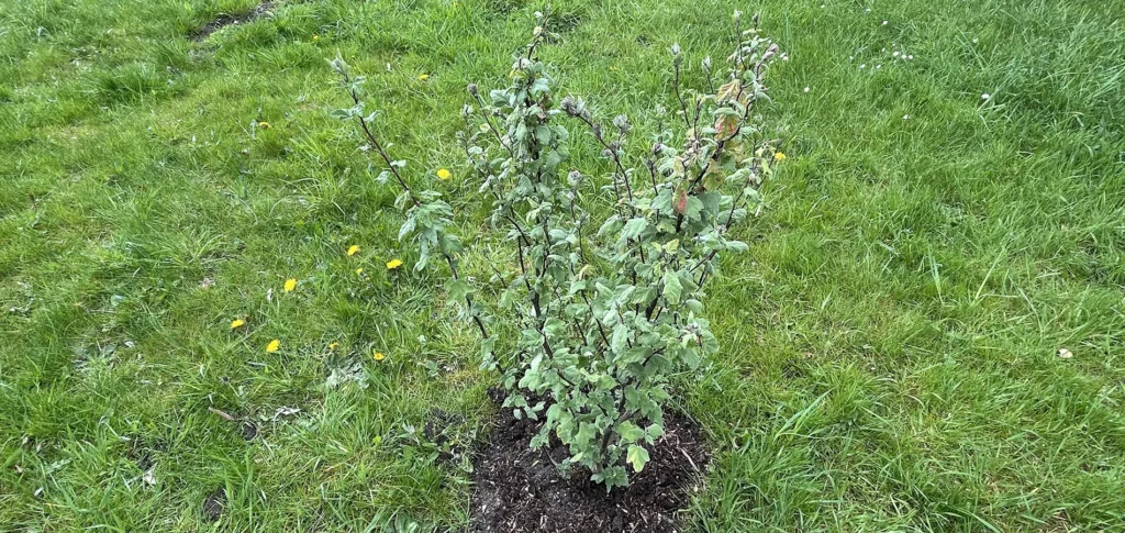 2025: Købt på Audebo Planteskole og plantet i plænen medio april. Blev “overfaldet” af hjortene, så ca halvdelen af busken måtte kasseres.