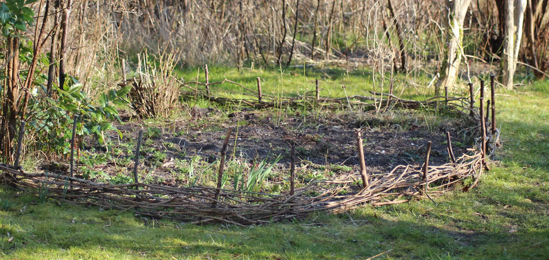 Sektion omringet af træer og buske, med to mindre bede og sti til bunden.