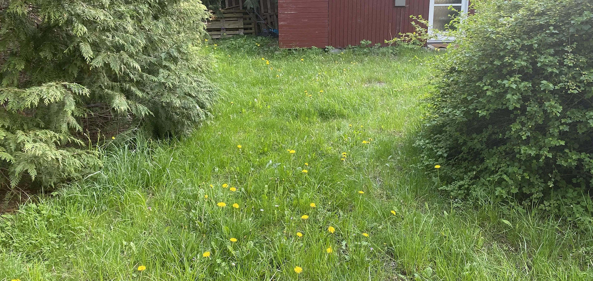 - Selve indkørslen er mest græs, mælkebøtter og tusindfryd.